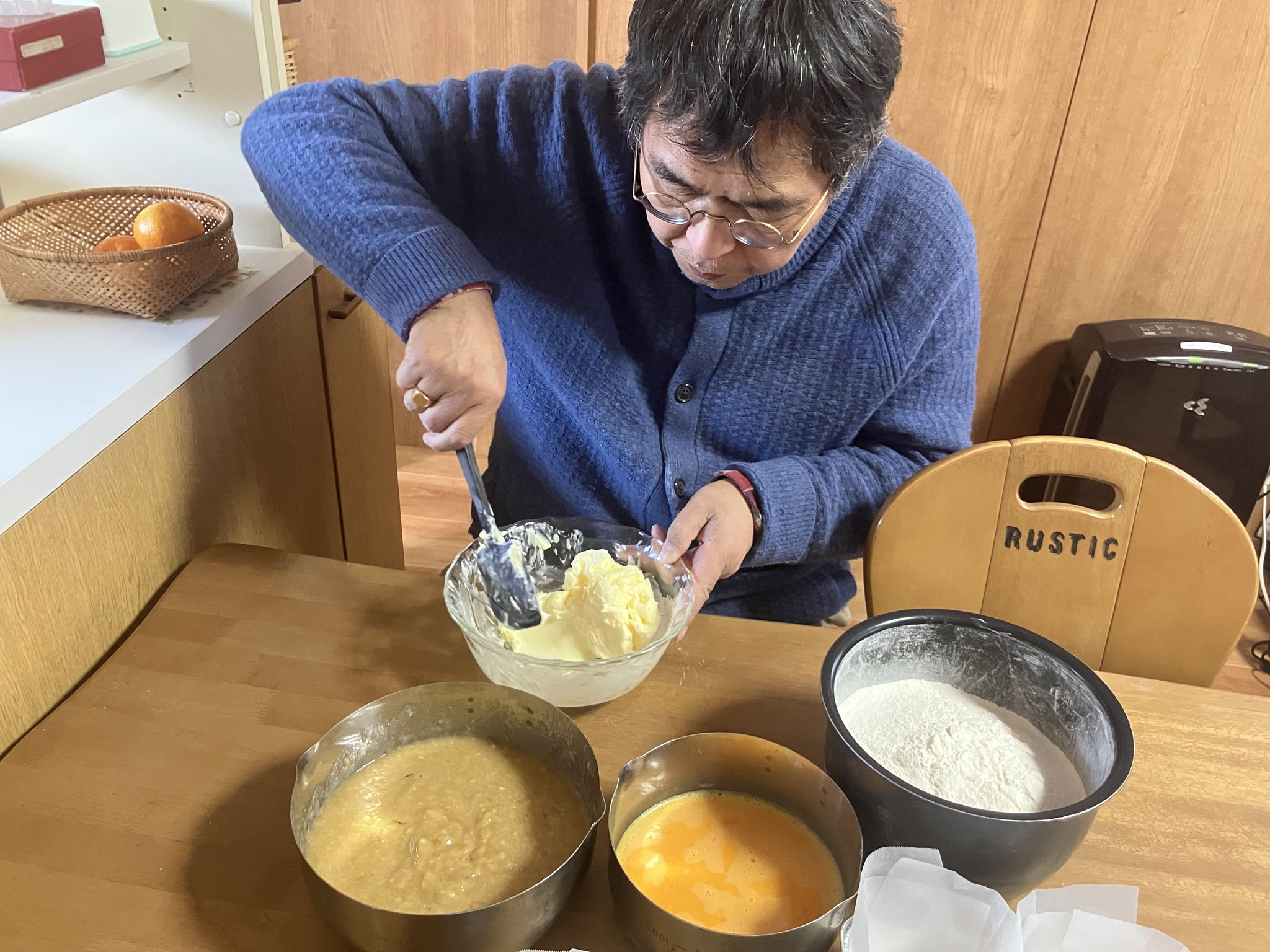 石原先生が大量合成したバナナケーキと学生のお祖母さんが栽培した蜜柑でお祝いしました。